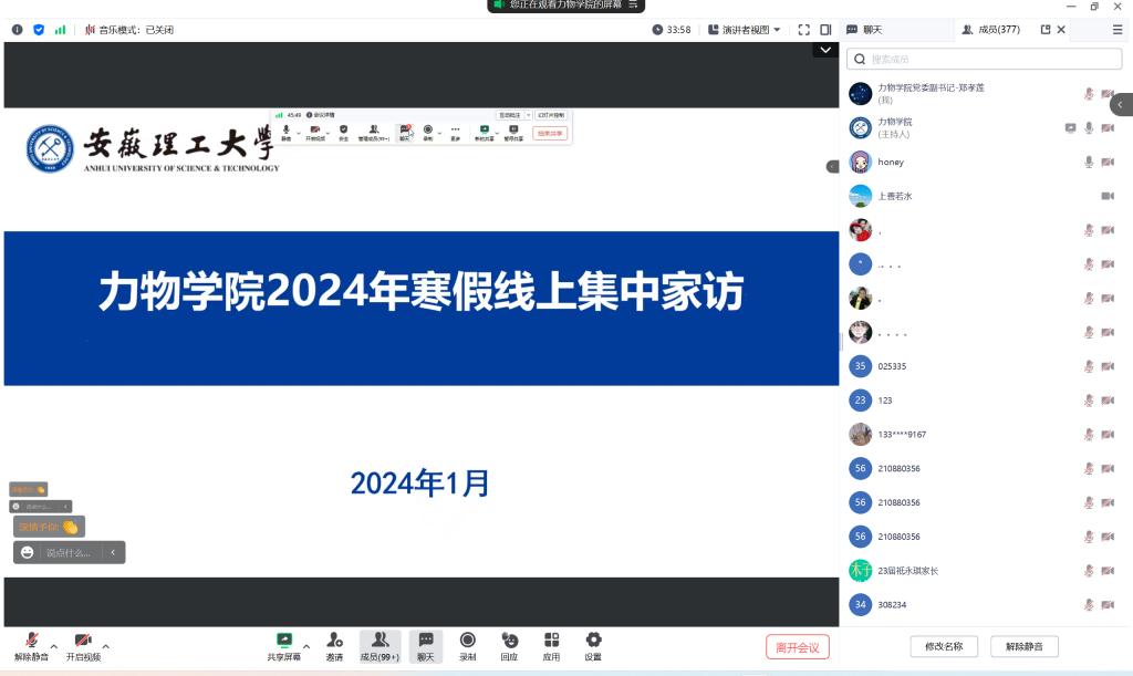 为深入贯彻习近平总书记关于教育的重要论述,落实立德树人根本任务,不断拓宽学生思想政治教育工作渠道,针对不同年级特点,1月30日-31日,中国十大正规信誉网赌通过线上方式分毕业班和非毕业班两种学生群体开展2024年寒假线上集中家访活动。学院学生工作负责人、全体辅导员、学生资助宣传大使,以及500余名学生家长参加会议。